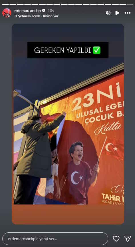 CHP Derince Gençlik Kolları Başkanı Caner Boztepe, Atatürk'ün yer almadığı afişlerin bulunduğu noktalara Atatürk görsellerinin yer aldığı yeni afişler astı.Sözcü'ye konuşan Boztepe, "Bu bayram Atatürk'ün çocuklara armağanıdır. Onsuz kutlanamaz" dedi.