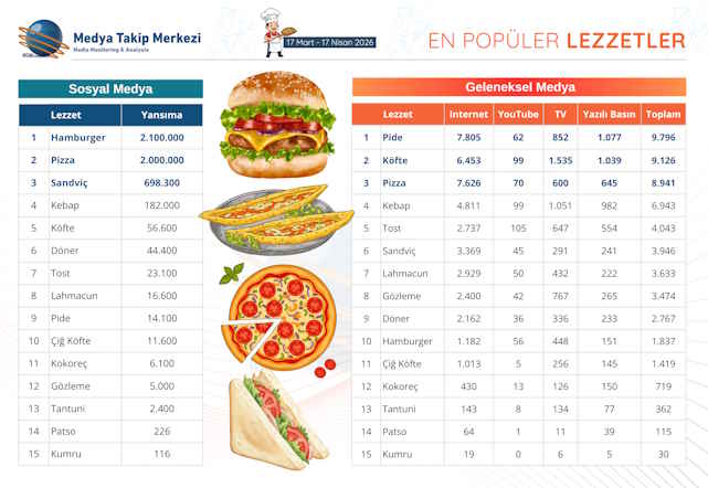 Online siparişlerde yaşanan kolaylıklar ve yemeğin içerik konusu haline gelmesi, popüler lezzet tercihlerini de etkiliyor. MTM Medya Takip Merkezi’nin medya ve sosyal medyayı içeren 10 bini aşkın kaynak üzerinden hazırladığı, 17 Mart - 17 Nisan 2026 tarihli “Popüler Lezzetler” araştırması, lezzet tercihlerinin mecralara göre şekillendiğini ortaya koyuyor.Hamburger ve Pizza Seviyoruz